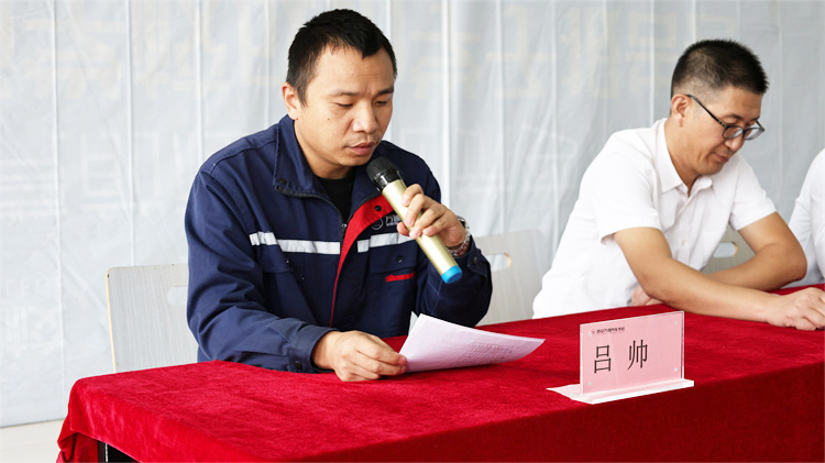 随后,学生代表胡木林森(新能源2302班)上台发言。他表达了对学校与企业提供实习机会的感激之情,并代表全体实习生郑重承诺:将以“空杯心态”投入学习,严守企业纪律,注重团队协作,用实际行动展现万通学子的专业素养与精神风貌。他的发言真挚有力,道出了同学们共同的心声与对未来的坚定信念。