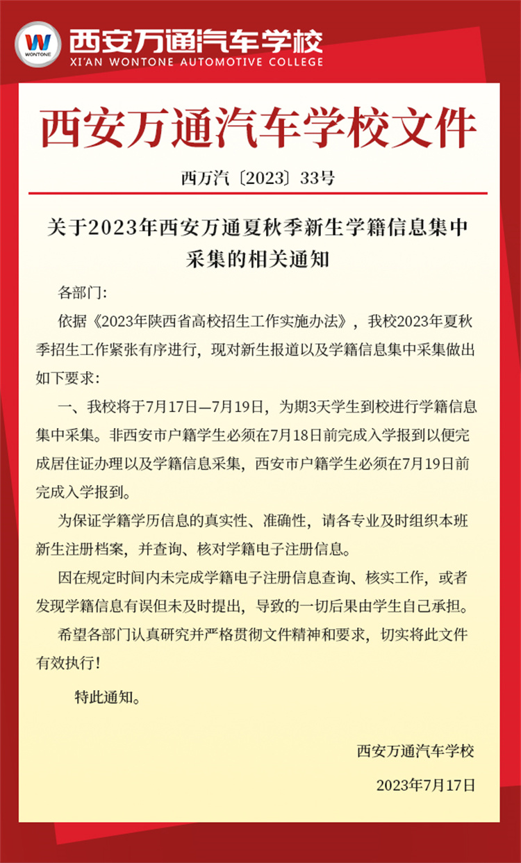众所周知,学籍注册对于学生来说是非常重要的,它关乎到你是否有资格能够在校学习。西安万通汽车学校2023年新生秋季学籍注册的具体时间为:7月17日—7月19日,如未及时抢报的学生只能等到明年统一注册,意味着毕业证书比同期入学的小伙伴晚拿一年。早注册,早拿证,早就业。