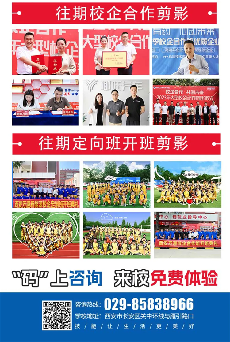 西安万通不断推进高品质企业的开发,与众多车企建立校企合作,共同培养符合时代发展的汽车技能人才,学子毕业可进入新能源车企从事技术、管理岗位 。